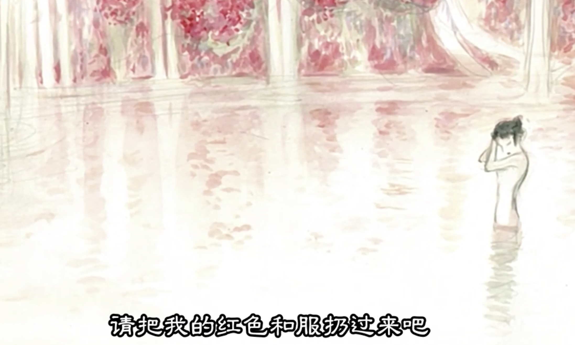 第一个梦境代表着的就是开始追逐梦想的充实和幸福。这里少年在岸边看着少女洗澡,和自己喜欢的人呆在一起的感受,是无比美妙的。而红衣少女就是少年内心梦想的映射,只是天野喜孝用少女这个实体化的人物呈现了出来罢了。