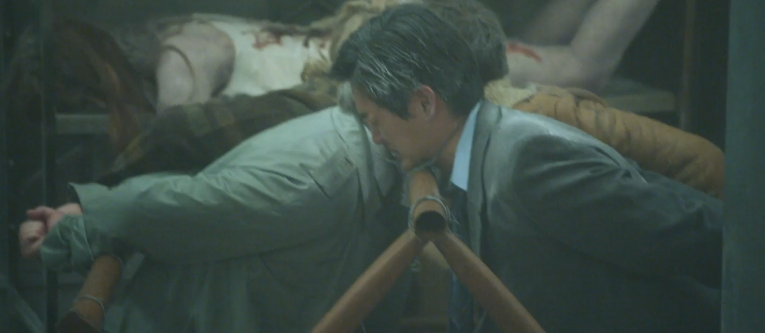 第三个事件他曾带着自己的妻儿去“狩猎”,他是猎手,妻儿是猎物。他端着枪,像玩游戏一样逐一杀掉了他们,把他们的尸体和乌鸦的尸体摆在一起,组成了他心中最完美的“战利品”。这一段也是让很多观众最不能接受的,是反人类的。