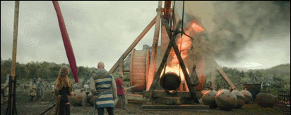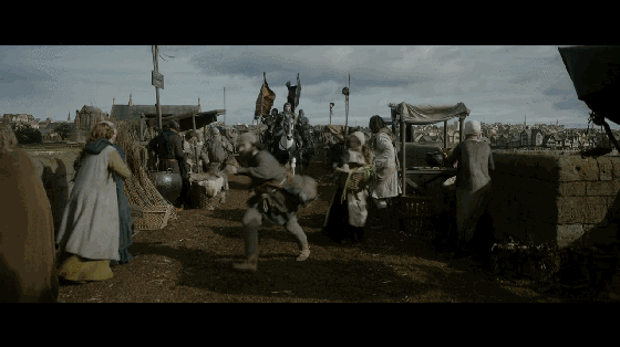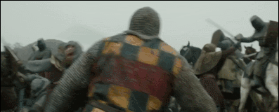 随着穿插的镜头语言,我们可以看到罗伯特和爱德华二世两边的形势形成鲜明的对比:一方面是罗伯特在危难之中、千辛万苦加冕为王;另一方面是爱德华二世以庞大且极尽奢华的誓师仪式高举龙旗。至此,关于冷兵器时代的战火逐渐被点燃,故事的节奏在这里也开始变得紧凑。
