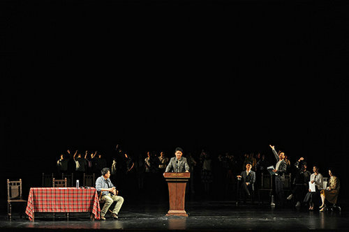喜欢话剧的朋友都了解《人民公敌》的故事,是一部探讨体系腐朽、阶层矛盾、公众倾向与真理的作品,已经诞生一百多年了,在全世界有无数个版本,这个林兆华版很特别,因为演员们都是拿着剧本登台,一边演一边看词,时而探讨一下人物的状态和配合的时机,时而调配一下灯光和音响,当然,这并不是真的排练,不是真的在看台词,而是在表演排练,就像表演工作坊的名作《暗恋桃花源》,通过排练的形式,打通了现实与戏剧的时空,让演员和观众明知入戏而入戏,因此更加着魔,同时,也更有集合创作的氛围。