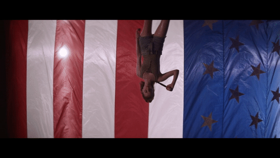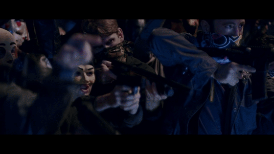下面是暴力即将发声的时刻,使用背景将这个“三原色”放大到有些夸张,随后第一起暴力事件发生了。(你没看错,镜头是颠倒的,也许是象征着即将颠倒的秩序)