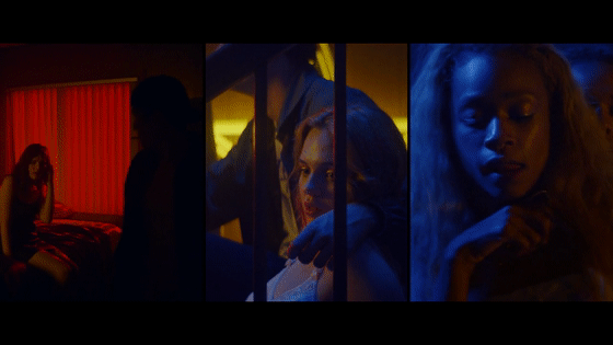 如果说前半段四个女孩发推特一段是为了实现密集叙述的话那么,影片从第11分19秒左右开始,有一段长达5分钟的分屏(全片都用分屏叙述的电影除外啊),可谓超长。这段分屏镜头却大多使用了固定镜头。其精彩之处在于,对每个区域内人物进行调度,使其状态与区域内色调吻合:或犹豫、或伤心、或迷乱、或放纵、或癫狂、或隔阂……