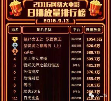 9月13日,由年轮映画、腾讯视频出品的《德扑女王2双面鬼王》在腾讯视频独家上线。凭借独特的题材、饱满的故事情节、紧凑的节奏以及精致的舞美和后期制作,《德扑女王2双面鬼王》一经上线点击量秒破1000万,三天点击量破3000万,日均点击1016万,周点击6098万双榜夺冠,截止至今天点击量已经突破8350万,日播放量均位于前三名。