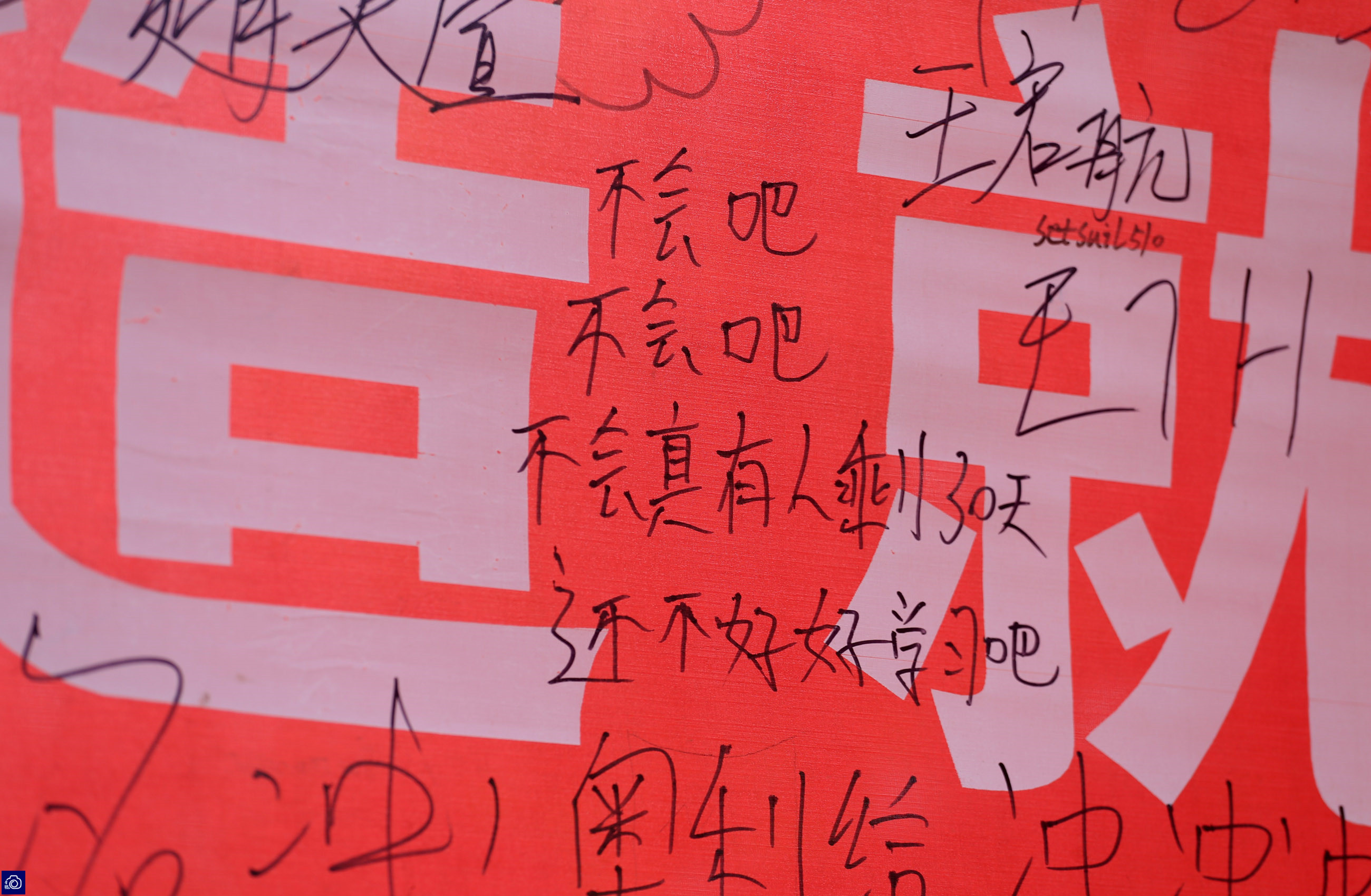 为了给同学们加油鼓劲,校园内到处悬挂着大红色条幅。不仅如此,很多高三学生为了鼓励自己,还专门在条幅上签上了名字,写下了口号。