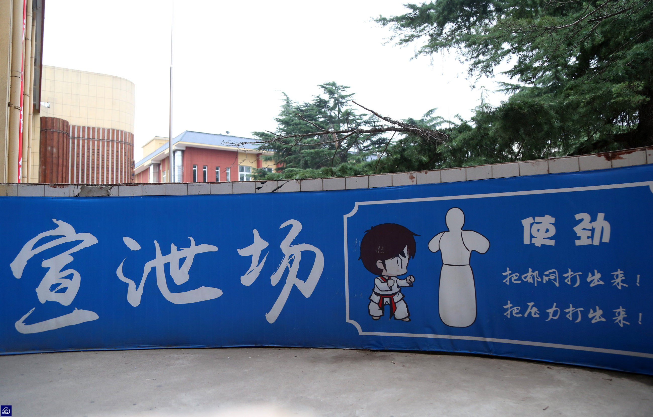 因考虑到高三的同学们在参加高考之前心理压力较大,从8年前开始,洛阳八中推出了一项很有趣的活动。每到高考之前,学校就会制作一批不倒翁“假人”摆放在宣泄场,让毕业班的同学在课余时间以拳打脚踢等方式,来宣泄压抑的情绪、放松心情。(图为,一名女生刚走到不倒翁旁边就踹了一脚。)