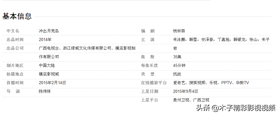 《冲出月亮岛》是广西电视台、浙江绿城文化传媒有限公司、横店影视制作有限公司出品的抗战剧,由陈伟祥执导,朱泳腾、韩雪、安泽豪领衔主演 。