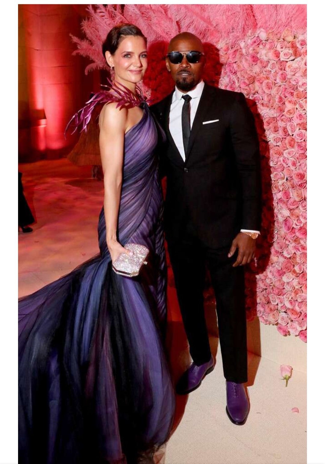 而其实在距2012年和阿汤哥离婚后,这并不是katie holmes爆出的第一任恋情了,离婚之后曾经爆出和jamie foxx的恋情,在大都会艺术博物馆的年度活动上两人更是双双亮相,katie holmes一袭紫色的拖地长裙加上肩上的羽毛尽显风姿。