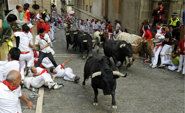 而你远在西班牙东北部潘普洛纳城的亲戚,则会参加每年7月6日-14日的西班牙奔牛节(san fermin)又名“关牛节”。