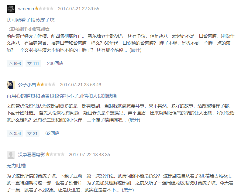 这部网大的热度蹭得相当及时,口碑崩得也是水银泻地。在豆瓣开播3.6,随后3.4、3.3、3.0,直到现在2.9.为啥下滑还那么快?原来很多豆瓣用户以为是潘粤明版,直接给了5颗星。