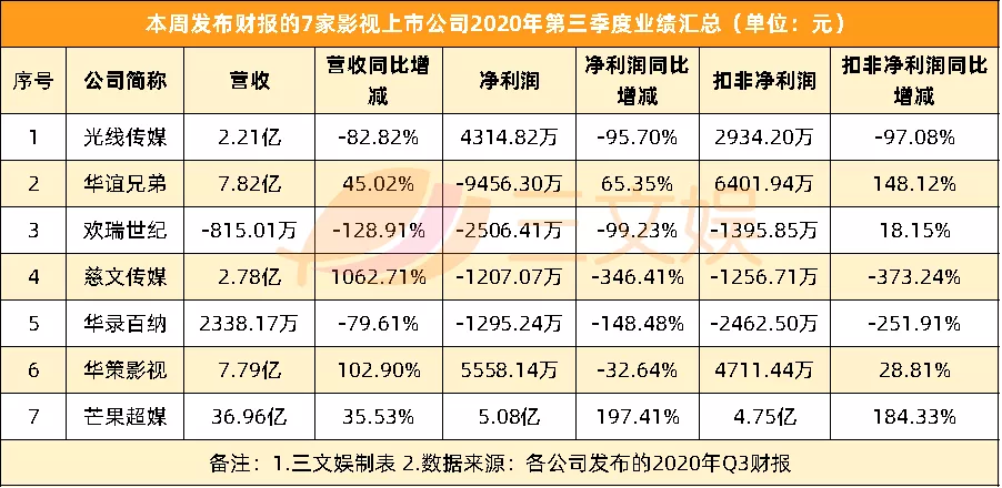 " 拓展阅读:影视公司财报“比惨”:光线传媒收入降八成,华谊兄弟前九个月净亏3.26亿