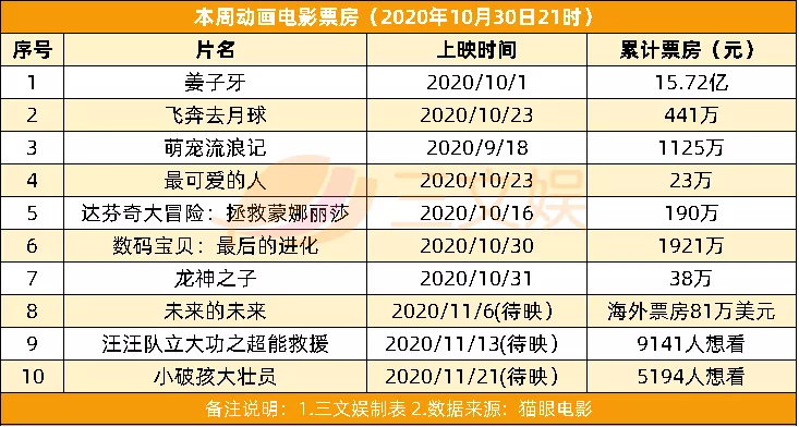 " 动画电影方面,截至10月30日21时,上周宣布放映期密钥延期至12月2日的《姜子牙》,累计票房为15.72亿。10月30日22时,猫眼上调电影最终票房预估至15.86亿元。