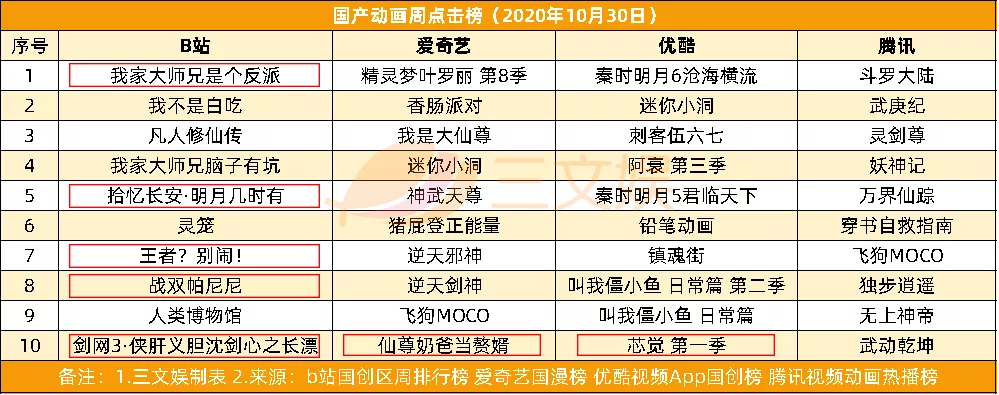 腾讯视频方面,本周玄机科技制作的3d玄幻热血动画《斗罗大陆》依旧稳居榜首,截至10月30日,更新至129集,累计225.5亿次播放量。本周没有新晋榜单作品,且榜单排名也没有发生变化。