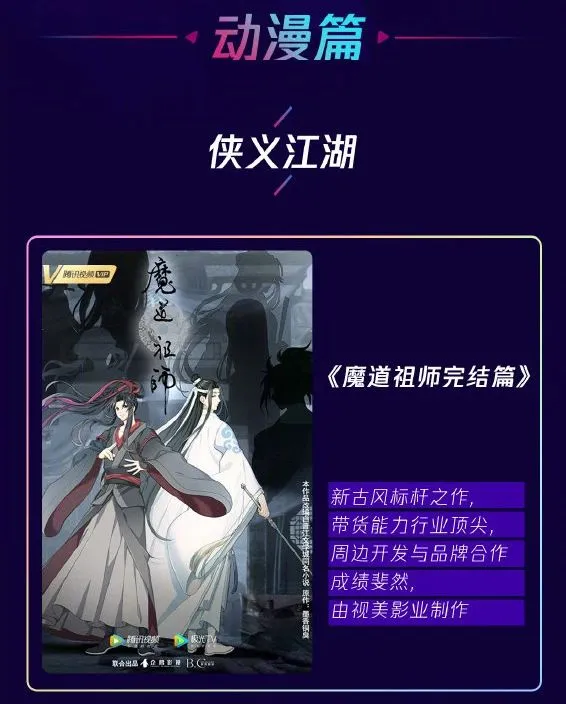 腾讯视频方面,发布了64部国产动画片单,并表示将持续发力多赛道ip矩阵开发,全面发挥斗罗大陆、魔道祖师等国民级ip长线优势,推出《吞噬星空》《龙族》《默读者》等国漫精品。