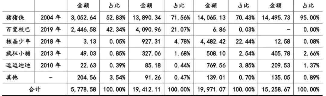 报告期内“猪猪侠”ip为咏声动漫贡献收入金额分别为14495.73万元、14065.13万元、13890.34万元和3052.64万元,占当年收入的比重分别为 95.00%、70.43%、71.56%和52.83%,为公司收入贡献最大的ip。
