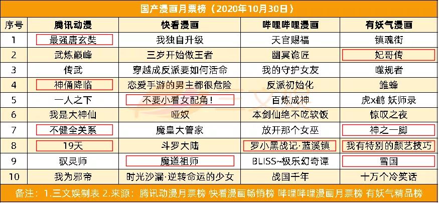 有妖气漫画方面,本周《镇魂街》继续蝉联榜首。《镇魂街》是由许辰创作的少年魔幻漫画,连载至今已更新320话,累计收获热度值42.95亿、收藏值418.87万,本周月票数为1160张。