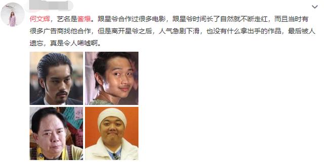 近日,有网友发文提到了酱爆:“酱爆跟星爷合作过很多电影,跟星爷时间长了自然就不断走红,而且当时有很多广告商找他合作,但是离开星爷之后,人气急剧下滑,也没有什么拿出手的作品,最后被人遗忘,真是令人唏嘘啊。”