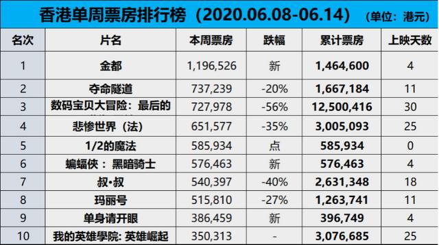 中国香港的疫情已得到有效控制,目前新增个案均是从海外输入,因而政府也进一步放宽社交“限聚令”,每次允许聚集人数从8人扩大至50人以上。不过,电影院仍然只允许开放50%的座位给观众,而且将继续坚持隔行售票等防疫措施。虽然是全世界唯一完全复工的电影市场,但香港市场也面临上映片目大幅减少,观众入场意欲低迷,而且不得进行餐饮等诸多限制d,当然,这远远好过那些还无法复工的市场。上周共有四部新片挤进周末票房前十,其中只有港产片《金都》开画突破百万港元,并低调登顶单周票房榜。挪威电影《夺命隧道》次周下跌两成,仍位列单周票房亚军。老片方面,日本动画《数码宝贝大冒险:最后的进化·羁绊》退居周末季军,法国电影《悲惨世界》排在第四。皮克斯动画《1/2的魔法》凭点映跻身前五,而《蝙蝠侠:黑暗骑士》重映只排在第六。