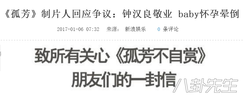 在《孤芳不自赏》播出之前,就有传闻说这部剧的主演狂用替身。播出之后,质疑的声音更大了。这时候,制片人就写了一封信回应说:钟汉良很敬业,baby甚至敬业到晕倒▼