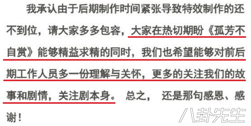 信中最后一段话让八先生觉得很可笑,翻译过来就是“你们别总鸡蛋里挑骨头,理解一下我们幕后人员的血和泪行不行?关注一下故事和剧情好不好?”▼