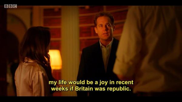 选举政治家或许也可以放松一下了,剧中的一位烤肉卖主哀悼英国萎缩(“削减军队……削减国民保健服务……邮局关闭……权力下放。越来越少”)的台词在电视上则变成一个隐喻,意思是女王把英国凝聚在一起就像用金属扦子劈开一片旋转的烤肉。