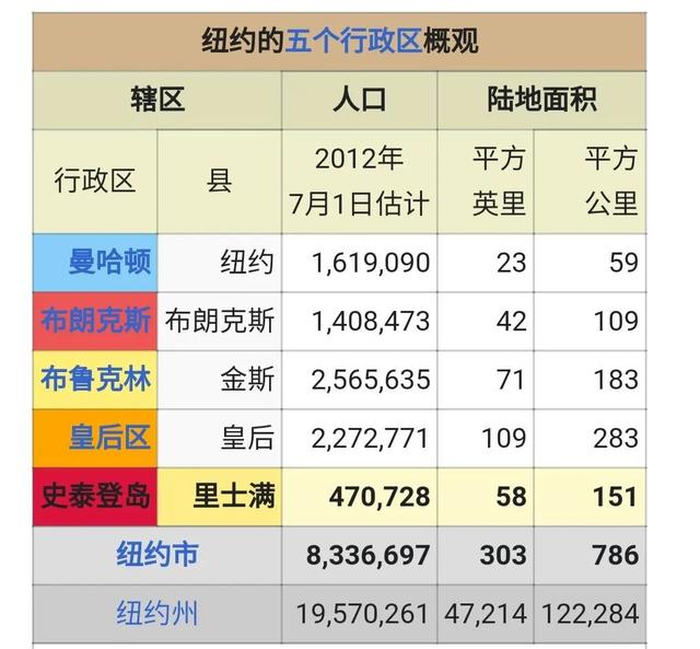 接下来再让我们看一下前几年统计的纽约各个行政区的人口,可以看出来,史泰登岛的面积虽然不小,但是人口与其它各区比差了一个量级,这也就是史泰登岛人口稀少的来由了。