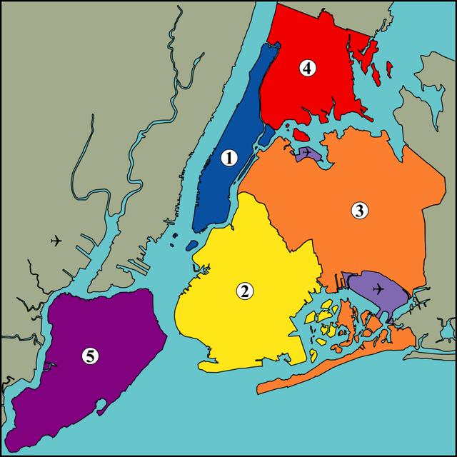 下图是纽约市的行政区划,其中标号为5的紫色区域就是史泰登岛,可以看到史泰登岛是唯一一个与纽约其它几区分开的行政区,就像电影中描述的那样,斯考特送她发小去纽约市中心考试是通过轮渡的方式过去的。