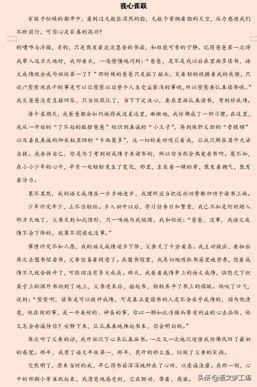 第二层:“雀跃”。“雀跃”:麻雀是以跳跃的方式行走。用以形容人因高兴而非常兴奋,像麻雀一样不停跳跃,也形容非常高兴。不难看出,“雀跃”即作文的题眼,注意“雀跃”指非常高兴,不能仅仅理解为一般的“高兴”“兴奋”。因何“雀跃”?如何“雀跃”?导语中的“突然”“偶然”告诉我们可以写惊喜的事,而“终于”则是说也可以写期待已久美梦成真的事。无论如何选材,不仅要快乐,而且要使我获得启发,催我向上,使我成长。