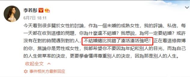 我们从来没有去否认婚姻中存在的美好,但相遇和缘分也是不能听由他人的催促,而敷衍了事。就像演员李若彤在社交平台中所说的那样,"不结婚总比找错了凑活凑活强"。