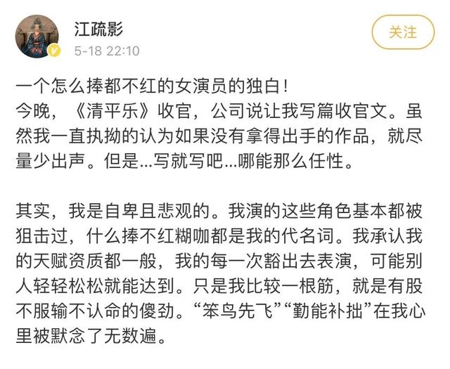 而对于王漫妮的处境和职场焦虑,江疏影也应该是能够感同身受的。她曾经自嘲是"怎么都捧不红的女演员"。这封发布于社交平台的独白,也一度登上热搜,许多人对其中的"自卑感"深有共鸣。我们有过全力付出却收获寥寥的感同身受,也深知这种自卑感和阴影会一直萦绕在心。