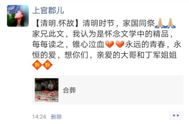 致读者:昨日清明,14:24胞妹禹燕在微信朋友圈转了本人的一篇旧文《合葬》,她在文头写道:“【清明·怀故】清明时节,家国同祭。家兄此文,我认为是怀念文学中的精品,每每读之,锥心泣血。永远的青春,永恒的爱,想你们,亲爱的大哥与丁军姐姐。”结果反响强烈,著名作家俞彬、著名文化学者张闳、长江文艺出版社原总编辑周百义、著名出版人向继东纷纷点赞、慰问。我对大妹说,今天这个时点选得好,他俩的故事很真善美,而且这种凄美又与武汉关联,是武汉现代版梁祝的回响,“说不上我写得好,主要是事情真。尤其是两家人相互搀扶,努力走出阴霾岁月,又遇自杀打击……还有18年后老人们的相聚,太有故事性和情感张力……”大妹则说:“故事好,哥写得也好,既有张力又很内敛,哀而不伤隐忍克制,入髓入心起承转合亦自然流畅。是能留下来,传下去的好文章”。在此转发,希望能让老刀这一最深的家族记忆,带给你的不仅仅是凄美……