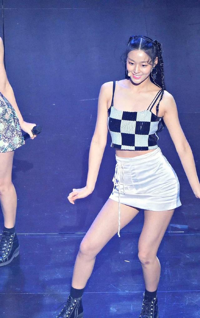 金雪炫上身穿格纹吊带,短短的上衣,秀出其纤瘦小腰,增添了些许性感小心机,下身搭配白色短裙,有织带自由垂搭而下,飘逸有动感,包臀式的版型,包裹其优美翘臀,极为吸睛。