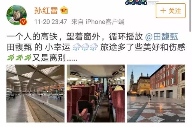 上月20日,孙红雷发布微博称“一个人的高铁,望着窗外,循环播放田馥甄的小幸运,旅途多了些美好和伤感,又是离别……”,文艺的语句再配上富有诗意的配图,真的是非常讲究呀!可谁曾想,就是这么一条接近完美的微博,却闹出了一个大笑话,因为把最重要的田馥甄艾特错了。
