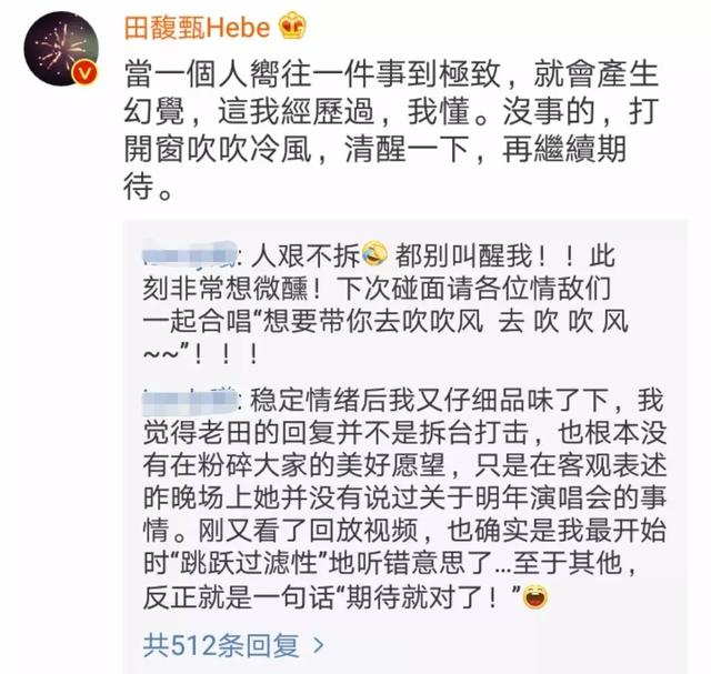 因为田馥甄亲自跑到她微博底下留言:“当一个人向往一件事到极致,就会产生幻觉,这我经历过,我懂。没事的,打开窗吹吹冷风,清醒一下,再继续期待。”