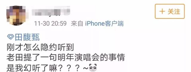 前几天有歌迷在微博上说道:“刚才怎么隐约听到老田提了一句明年演唱会的事情,是我幻听了吗???”
