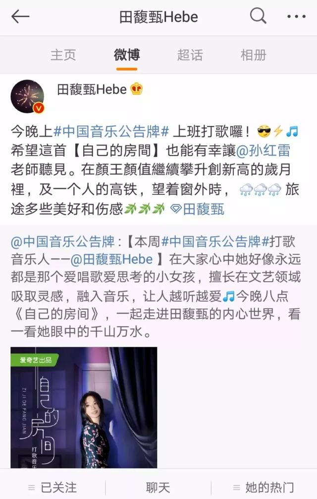 接着后面就更精彩了,前几天田馥甄上音乐公告牌宣传自己的新歌《自己的房间》时,冷不丁隔空cue了一下孙红雷:“今晚上音乐公告牌打歌咯!希望这首《自己的房间》也能有幸让孙红雷老师听见。在颜王颜值继续攀升创新高的岁月里,及一个人的高铁,望着窗外时,旅途多些美好和伤感。” (美好是美好,可伤感也一定要带上吗hhhhhh)