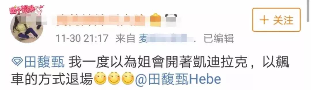 还有前几天田馥甄出席在凯迪拉克中心出席群星演唱会时,一位歌迷调戏到:“我一度以为姐会开着凯迪拉克,以飙车的方式退场”,之后也马上收到了本尊回复:“我也以为我可以。”