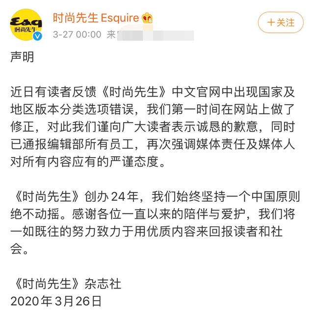 在大众的连身讨伐下,杂志方于3月27日凌晨发表了以下声明,承认了地区版本的分类选项错误,对读者表示了歉意。