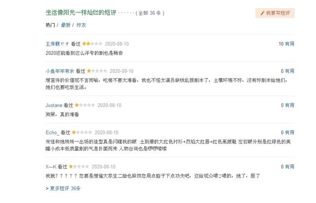 截至老编发稿,《生活像阳光一样灿烂》在豆瓣形成了36条短评,均是一星或者两星的差评,没有三星及其以上的短评。这种“清一色差评”的状态,在以往的电视剧当中是很难见到的。再差的作品,也会有零星的观众给五星的。这一次,没有任何观众给出好评,其中滋味,可见一斑。