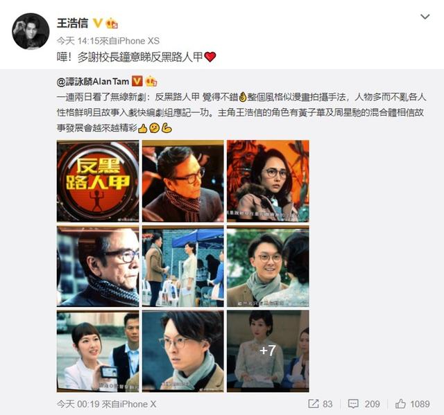 得到谭咏麟肯定的王浩信,随后都在微博转发贴文,并留言多谢校长钟意看《反黑路人甲》。