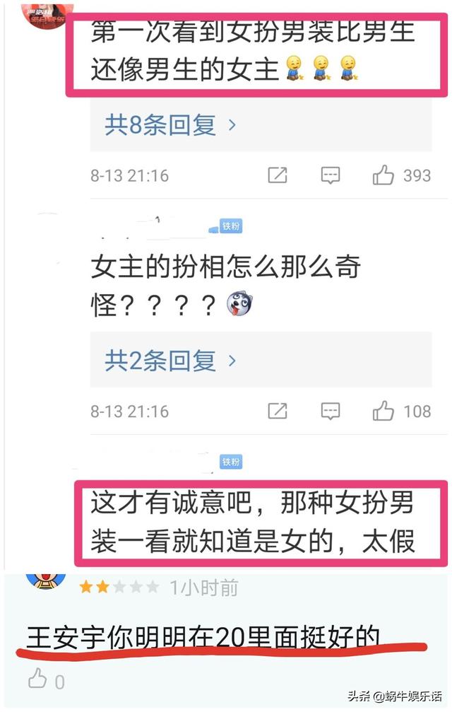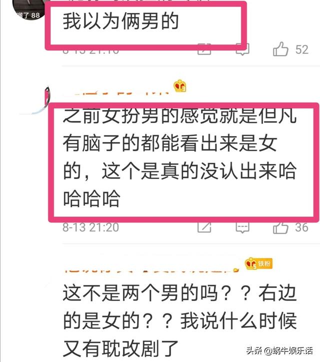 反观女主的讨论度,却比较高。因为这部剧也是关于“女扮男装”的故事,有点撞车《漂亮书生》然而因为女主本身长相就比较英姿飒爽,所以男装扮相一点也不违和。就像粉丝说的,别的剧情,可能一看就知道是女扮男装,但是这部剧开篇还以为是两个男主。