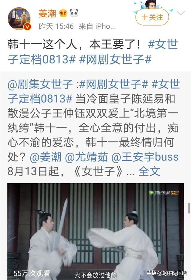 首先是男主姜潮在开播前一天,在微博上转发了《女世子》的官方微博,写道“韩十一这个人,本王要了”,并且标注了“女世子定档0813”这样的超话。
