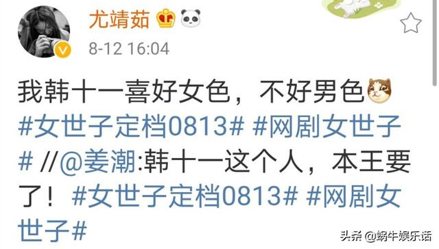 而女主,也就是韩十一的扮演者尤靖茹则转发了姜潮的微博,并且写道:我韩十一喜好女色,不好男色。