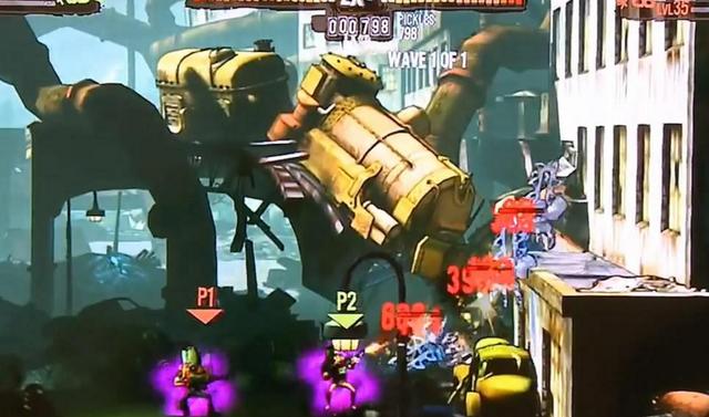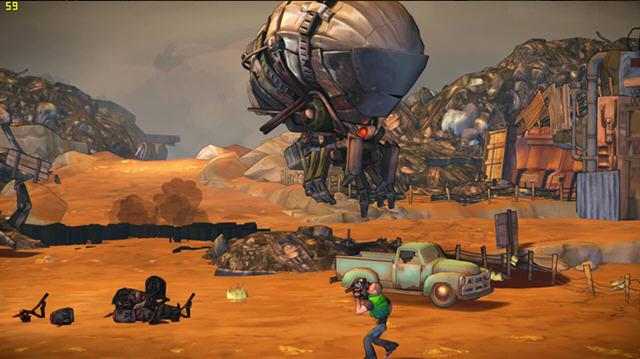 游戏画面在现在动辄15gb容量的今天毫无优势,虽然是用虚幻3引擎制作,但是600mb不到的小巧身材容不下太华丽的光影特效、太精致的纹理细节,但是游戏的画面非常火爆。游戏采用和《无主之地》类似的漫画风格,人物、建筑边缘都有一层淡淡的黑边。漫画中透露这一种无厘头的幽默风格,主角的造型,以及枪械、服装都有恶搞的感觉。顺带一提,个人感觉主角的眼神太像金馆长了。