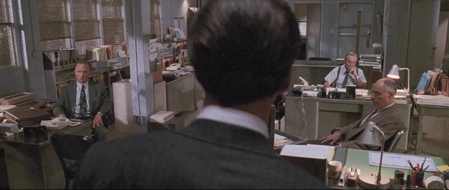 首先,我们看看杰克·莱蒙扮演的老沙利的生存状态。电影开始便是他给病在医院的女儿打电话,从聊天中我们可以听出,女儿需要人在医院照顾,同时也需要医疗费用。相比于下面要谈的三位职员,老沙利是生活压力最大的一个。老沙利在电话中承诺一会儿开完会去看女儿,可是在风雨交加的夜里,注定不能如期会面。