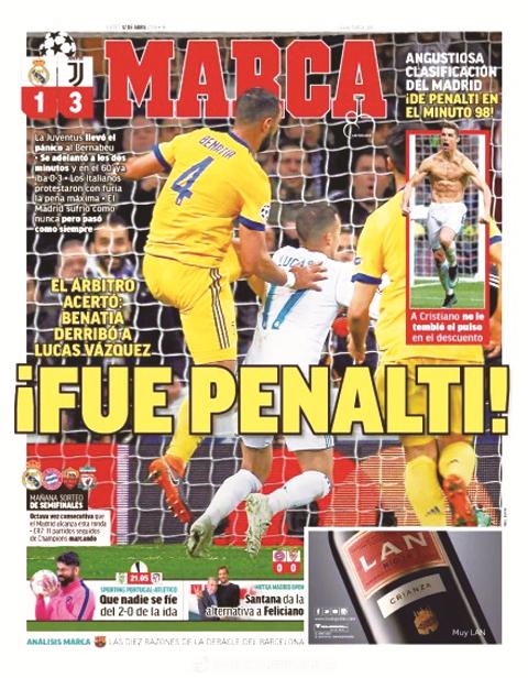 西班牙加泰罗尼亚的《每日体育报》打出了《世纪大劫案》的标题,指出:首先,裁判在第93分钟“发明”了一个不存在的点球,让皇马进入欧冠四强;其次,布冯被红牌罚下,尤文图斯在看到无法上演历史性的逆转后,都崩溃了,这简直是丑闻。该报还表示,皇马又一次收获了大礼。在又一次的丑闻后,皇马进入了欧冠半决赛,一年年历史都在重复。有利的点球、对方球员被罚下、越位,皇马获得的好处太多了。争议判罚、丑闻,一直都是皇马在欧洲赛场的伴侣,事实上在西班牙也是如此。
