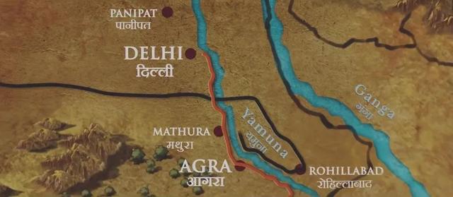 长达165分钟的片时里,前120分钟都在描摹双方的战前准备以及战略布局,以一种极为宏观的角度,展现了印度当时的复杂战局以及特殊地形,为了更为具象化,影片还不止一次地秀出了详尽的地图,以帮助观众更好地了解——马拉地人在消灭了海德拉巴的尼扎姆后,基本统一了印度南方,与北边残存的莫卧儿王朝形成地理上的割据状态,但后者必须一直上岁才得以不被消灭。于是,心有不甘的莫卧儿皇帝,恳请更北边的阿富汗侵略自己以对抗马拉地人,马拉地人遂以保卫领土的名义应战,迅速组建联盟军。