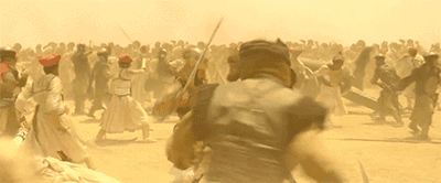 结尾40分钟的战争场面,更是严格遵循了客观、现实的理念,既没有《帕德玛瓦蒂王后》里“走台步式”的炫耀布阵、《一号自由勇士》中地道里蹦出骑兵的奇观,也没有《巴霍巴利王》中椰子树弹射突围、《凯萨里》中一人单挑百人的开挂式个人特写,而是非常朴实地从正规的阵型变化、炮火试探、步兵冲阵依序展开,直至近身厮杀的肉搏戏,也都是接地气的大力挥砍,几乎没什么花活,期间甚至还刻画了逃兵的现象。