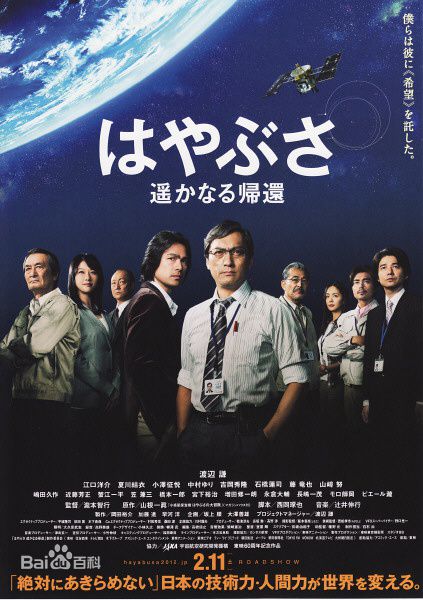 《隼鸟号:遥远的归来》是由东映株式会社制作的剧情片,该片由泷本智行执导,西冈琢也、山根一真担任编剧,渡边谦、江口洋介、吉冈秀隆领衔主演,该片于2012年2月11日在日本上映。2003年5月9日小行星探测器“隼鸟号”在日本发射,其任务是采集距