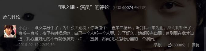 @ 小白、:跟女票分手了,为什么?她说:你听这个 一直单曲循环,听到我回来为止。然而我相信了,一直听一直听,夜里有时候想她,自己一个人听一个人哭。过了好久,她都没有出现,直到现在我才知道,我心里对她的不舍就像演戏一样,一直演,然而我只是她心里的一个演员。