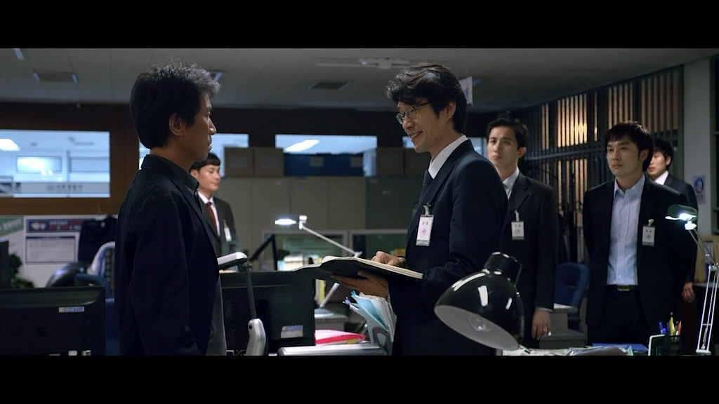这种重点描述办案过程,其实与影片中间穿插,纪检处在查处警务人员贪污案暗暗契合。那么,导演在这里,他想重点说明什么呢?其实,无外乎,警察这个特殊的职业,或者说身在重要职位的人,其犯罪起来,已经有了具备反侦察的能力,而这种能力并不是凭空想象出来的,而是要通过具体事例展现出来。但警察从正义转变为邪恶,需要有一个过程,正如影片在介绍高建洙开车撞了人,下车查看伤者,确认伤者已经死亡,准备打急救电话,正展现了一个作为有良知的公民应该做到的事,但是中间女儿打过来的电话,一辆从另一边开来的警车出现,致使他改变了想法,而这种想法的转变,可能对于观众来说,有些突兀,但随后交代高建洙所在的整个警察队伍贪污后,这种转变自然也就变得顺畅起来了。但影片仅仅就讲述这些吗?显然不是!